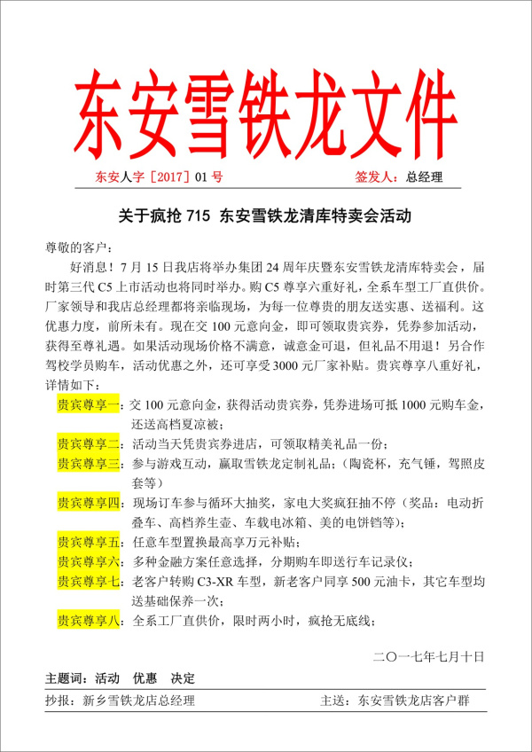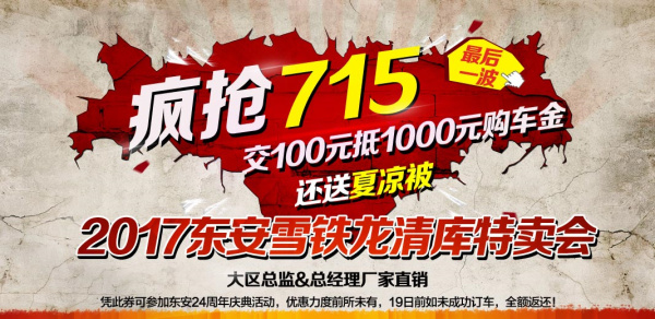 2017東安雪鐵龍年中冰點(diǎn)大促,大區(qū)總監(jiān)&總經(jīng)理廠家直銷(xiāo),瘋搶715,交100元意向金抵1000元購(gòu)車(chē)金,另外還送夏涼被,優(yōu)惠力度大。