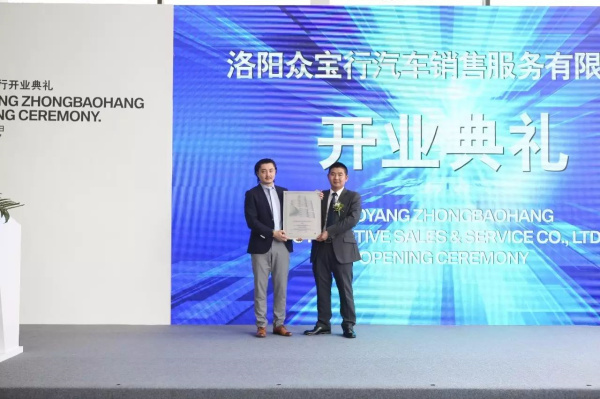 寶馬(中國)汽車貿(mào)易有限公司西區(qū)銷售經(jīng)理 楊筱剛先生(左)向洛陽眾寶行汽車銷售服務(wù)有限公司總經(jīng)理 白冰先生(右)正式授權(quán)